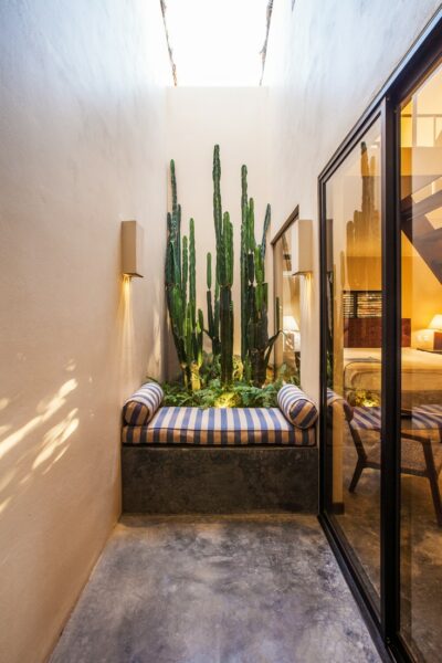 Minimalist yet comfortable rooms feature king-sized beds, unique art, tropical plants, organic cotton linens, artisan tiles, and semi open-air rain showers. Some rooms have high ceilings and a loft with an additional queen bed to accommodate up to four guests.