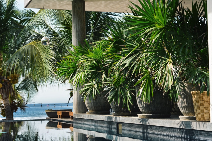The hotel sits right on the sand and offers beautiful views throughout. Lush palm trees and landscaping are a stunning contrast to the property’s concrete/wood accents and beachfront black-tiled infinity pool.